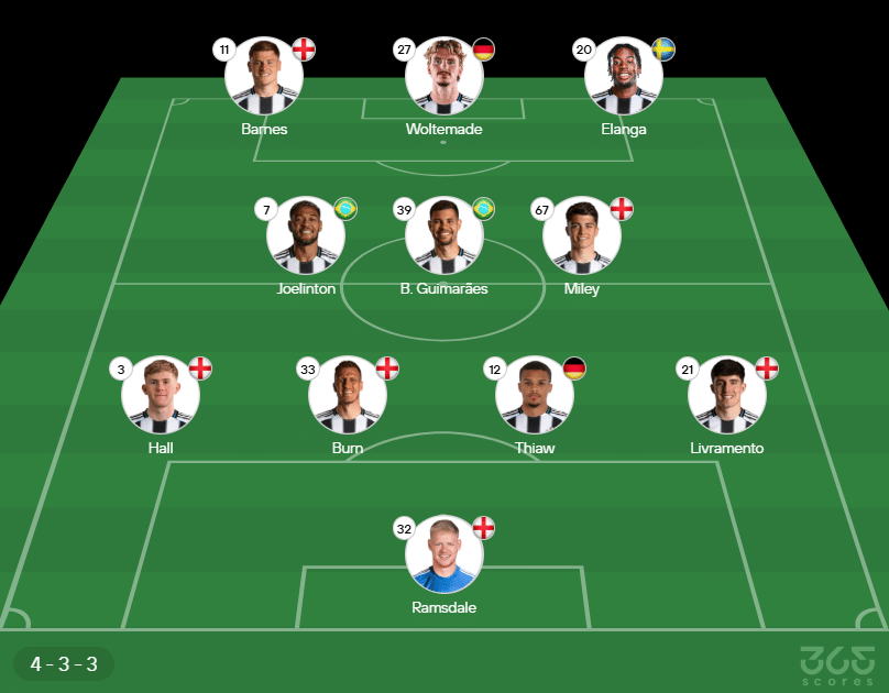 Provável escalação do Newcastle: Ramsdale; Livramento, Thiaw, Burn e Hall; Miley, Bruno Guimarães e Joelinton; Elanga, Woltemade e Barnes. Técnico: Eddie Howe.