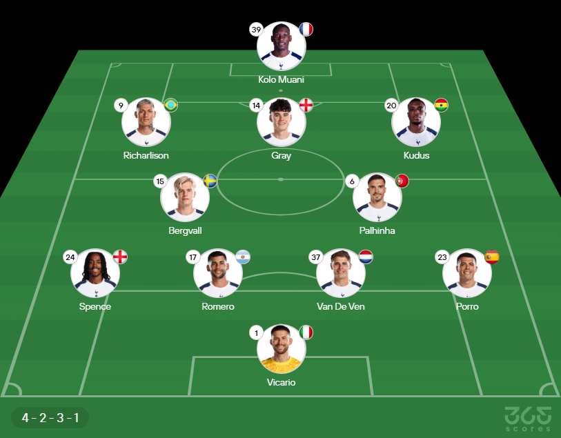 - Provável escalação do Tottenham: Vicario; Pedro Porro, Van De Ven, Romero e Spence; João Palhinha e e Bergvall; Kudus, Gray e Richarlison; Kolo Muani