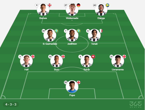 Provável escalação do Newcastle: Pope, Livramento, Schär, Burn, Hall; Joelinton, Tonali, Bruno Guimarães; Elanga, Barnes, Woltemade. Técnico: Jason Tindall