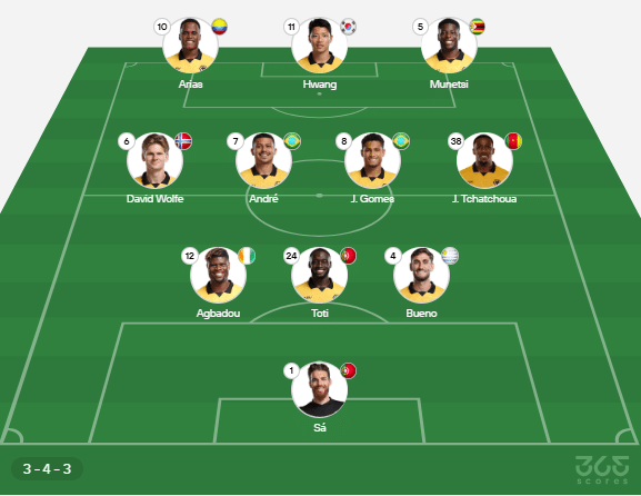 Provável escalação do Wolverhampton: Sá, Bueno, Toti, Agbadou; Tchatchoua, João Gomes, André, David Wolfe; Muntesi, Arias, Hwang. Técnico: Vitor Pereira