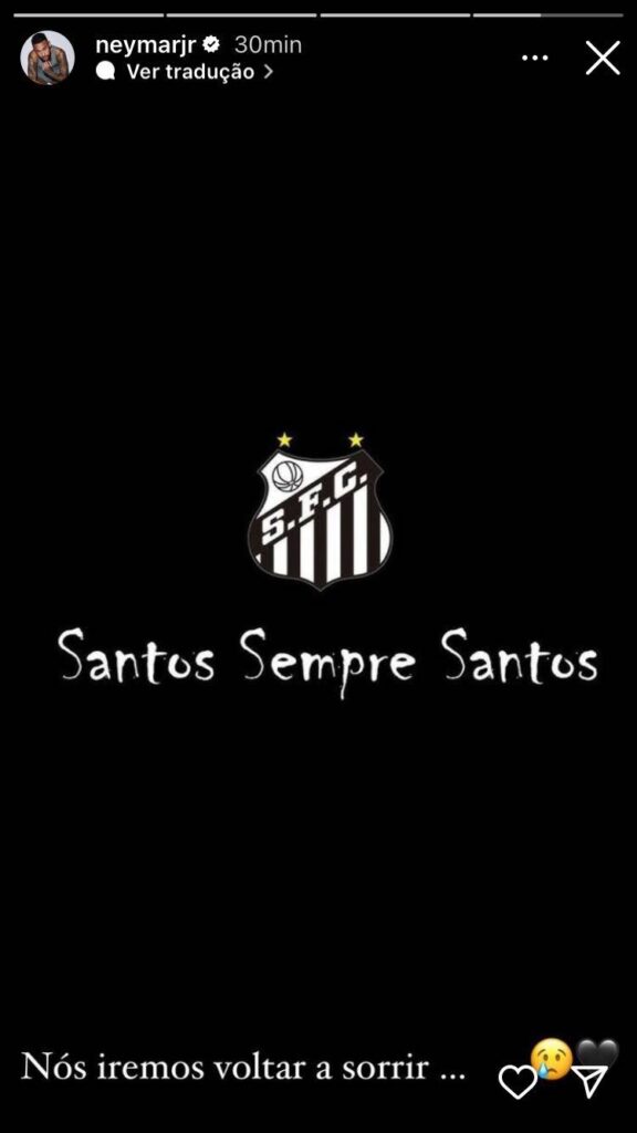 Ídolo do Santos, Neymar usou as redes sociais para demonstrar apoio ao time logo após a confirmação do rebaixamento para a Série B. Atualmente no Al Hilal, da Arábia Saudita, o atacante usou a frase “Iremos voltar a sorrir” como movitação.