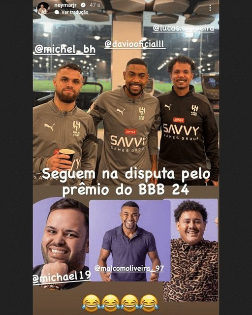“Seguem na disputa pelo prêmio do BBB 24”, escreveu Neymar na montagem contendo os ‘brothers’, que foram comparados a Michael, ex-Flamengo, Malcom, ex-Zenit, e um membro do Al Hilal. Ao realizar as marcações, o brasileiro brincou e colocou os perfis oficiais “trocados” de maneira proposital.