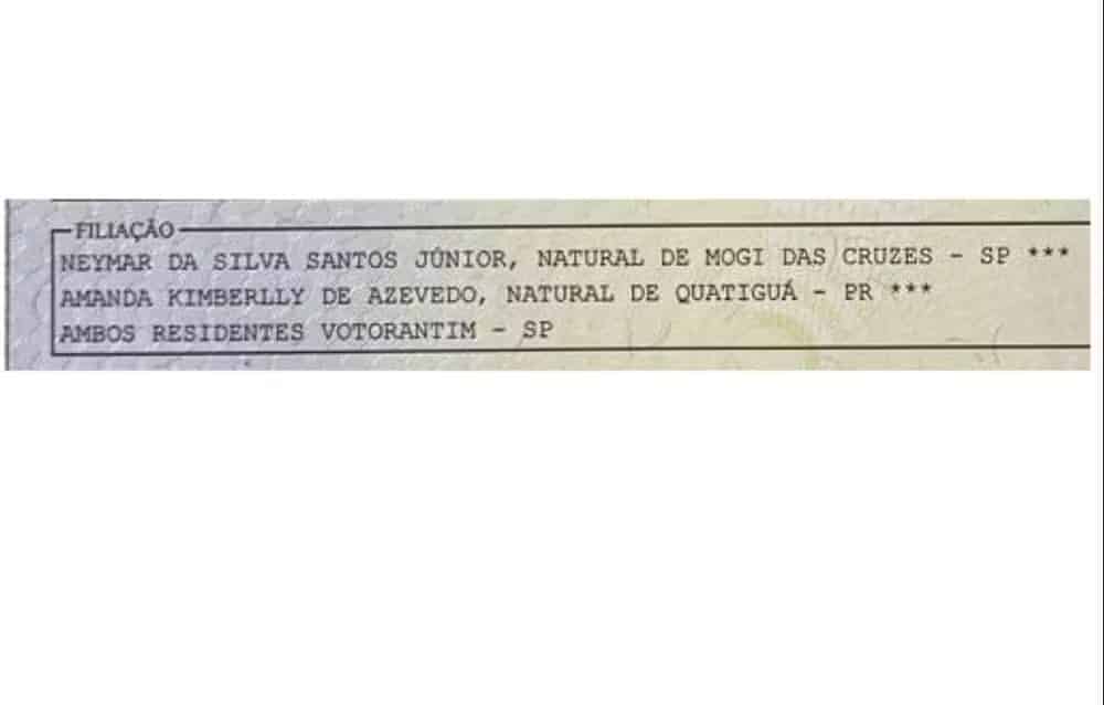 O atacante Neymar registrou Helena, filha dele com a modelo Amanda Kimberly. A menina nasceu na última quarta-feira (3), e foi registrada pelo jogador, conforme mostra a certidão de nascimento divulgada pelo jornalista Léo Dias.