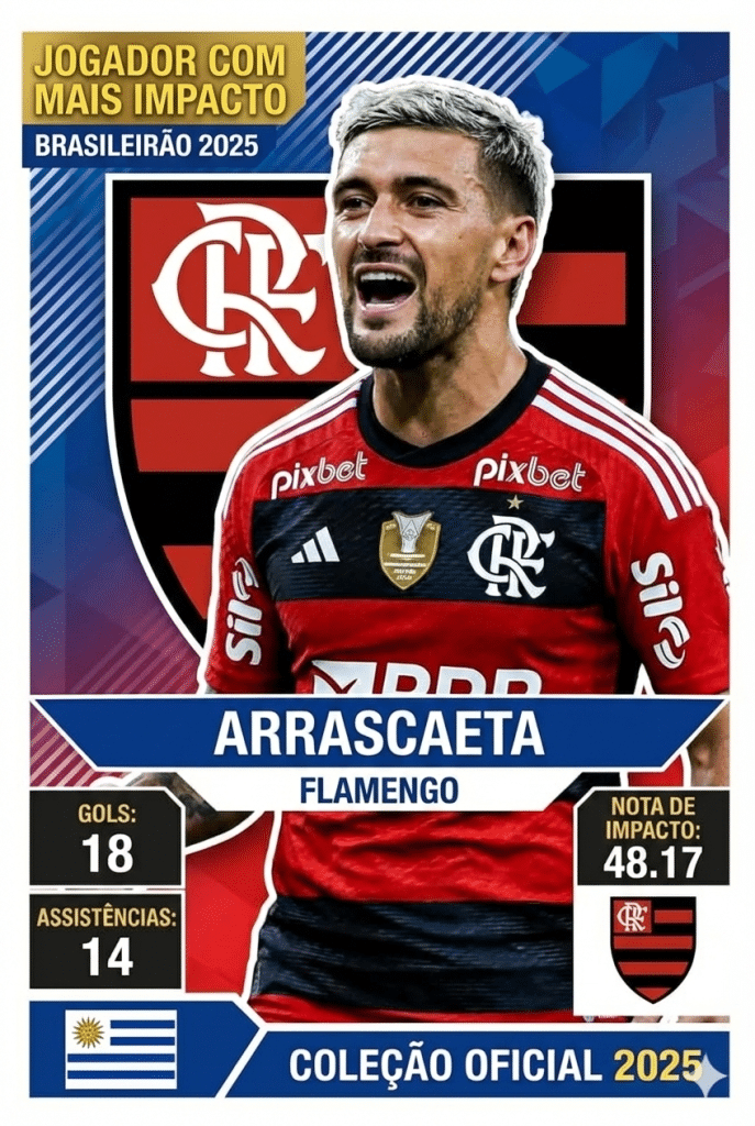O uruguaio do Flamengo não apenas desfilou sua técnica habitual, mas foi o jogador que mais influenciou diretamente a pontuação e o desempenho de seu time ao longo da competição. Ele marcou 18 gols e deu 14 assistências, sendo peça-chave no título rubro-negro. Em 33 jogos, Arrasca teve uma Nota de Impacto média de 48.17.