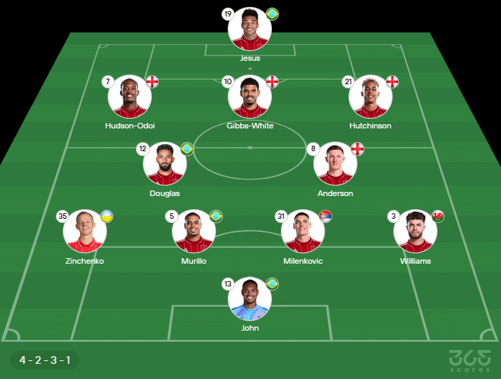 - Escalação do Nottingham Forest: John; Williams, Milenkovic, Murillo, Zinchenko; Anderson, Douglas Luiz, Hutchinson, Hudson-Odoi, Gibbs-White; Igor Jesus