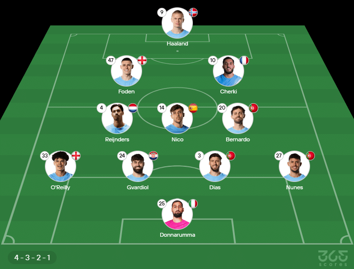 - Escalação do Manchester City: Donnarumma; Matheus Nunes, Ruben Dias, Gvardiol, O’Reilly; González, Bernardo Silva, Reijnders, Cherki, Foden; Haaland