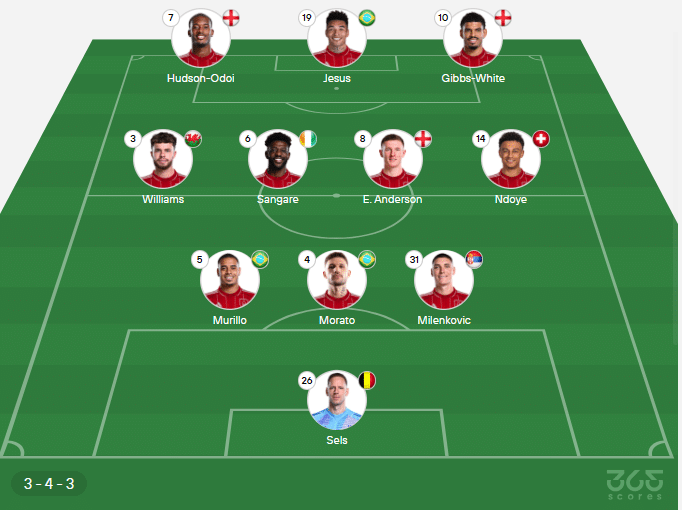 - Provável escalação de Nottingham Forest: Sels, Milenkovic, Morato, Murillo; Ndoye, Anderson, Sangaré, Williams; Gibbs-White, Hudson Odoi, Igor Jesus