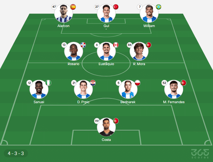 Provável escalação do Porto: Diogo Costa, Fernandes, Bednarek, Prpic, Sanusi; Eustáquio, Rosario, Rodrigo Mora; William Gomes, Alarcon, Gul. Técnico: Francesco Farioli