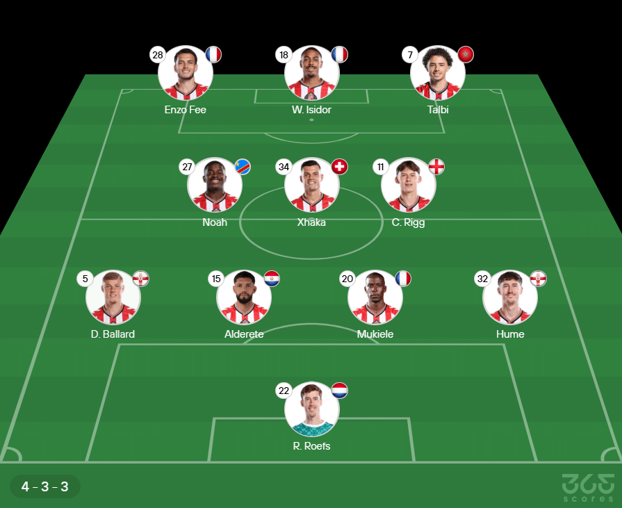 - Provável escalação do Sunderland: Roefs, Ballard, Alderete, Mukiele e Hume; Noah, Xhaka e Rigg; Enzo Fee, Talbi e Isidor