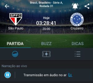 O aplicativo 365Scores chega com mais uma novidade: narração ao vivo dos principais jogos do Brasileirão. Agora, além de seguir os lances e estatísticas em tempo real, você poderá ouvir a transmissão das partidas. E o melhor: é totalmente gratuito! E o primeiro jogo já está no ar. Siga e ouça São Paulo x Cruzeiro!