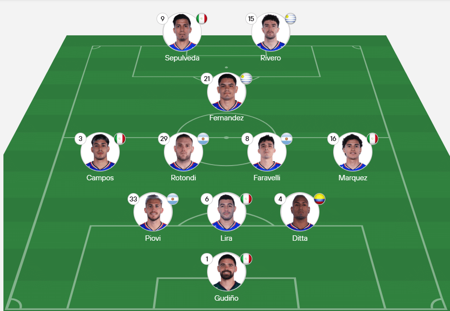 O Cruz Azul deve enfrentar o Flamengo com Gudiño; Willer Ditta, Erik Lira e Piovi; Jeremy Marquez, Faravelli, Rotondi e Omar Campos; Gabriel Fernandez, Rivero e Sepulveda.