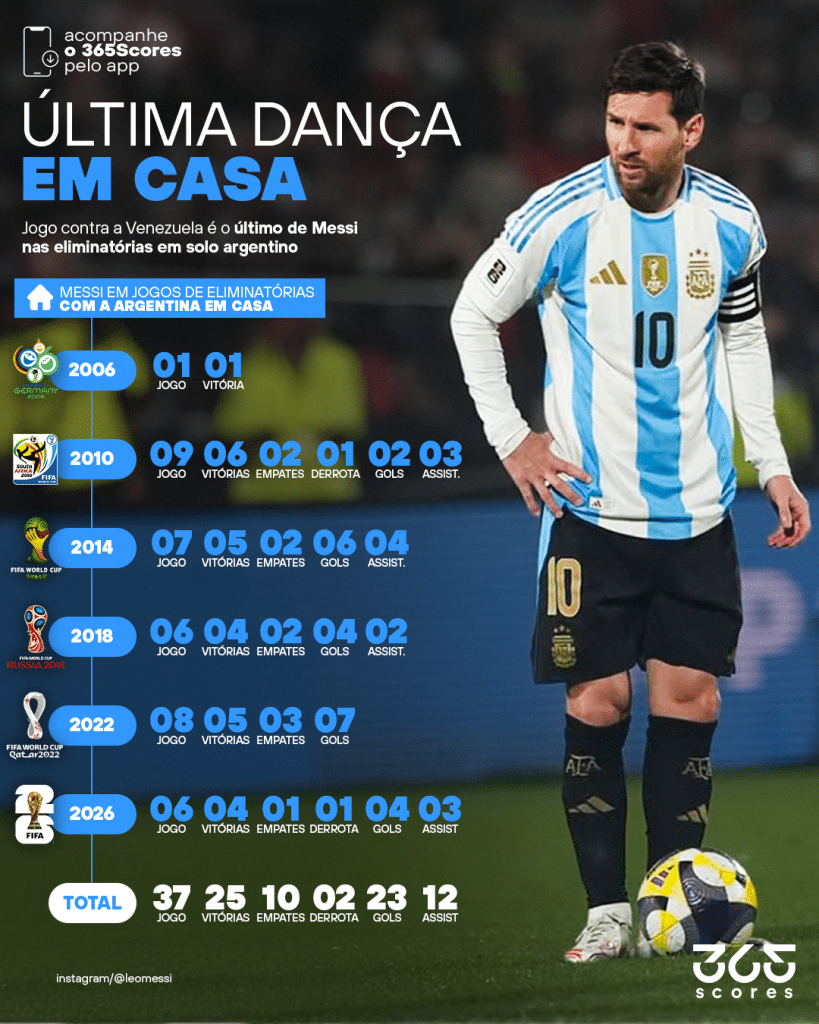 O duelo da Argentina contra a Venezuela na noite desta quinta-feira, em Buenos Aires, marca o último jogo de Lionel Messi em solo argentino pelas Eliminatórias de Copa do Mundo.