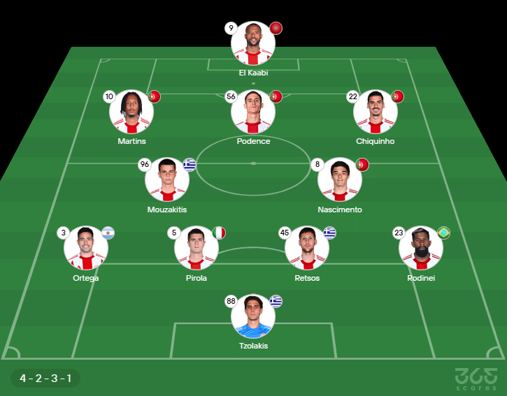 - Escalação do Olympiacos: Tzolakis, Rodinei, Retsos, Pirola e Ortega; Diogo Nascimento, Mouzakitis, Chiquinho, Gelson Martins e Podence; El Kaabi