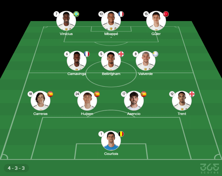 - Escalação do Real Madrid: Courtois, Trent Alexander-Arnold, Asencio, Huijsen e Carreras; Valverde, Bellingham e Camavinga; Arda Güler, Vini Jr e Mbappé