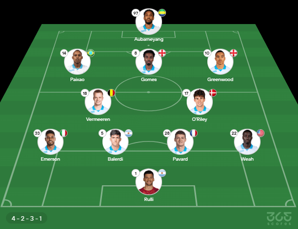 - Provável escalação do Olympique de Marselha: Rulli; Weah, Pavard, Balerdi, Emerson; O’ Riley, Vermeeren, Gomes; Greenwood, Paixão, Aubameyang