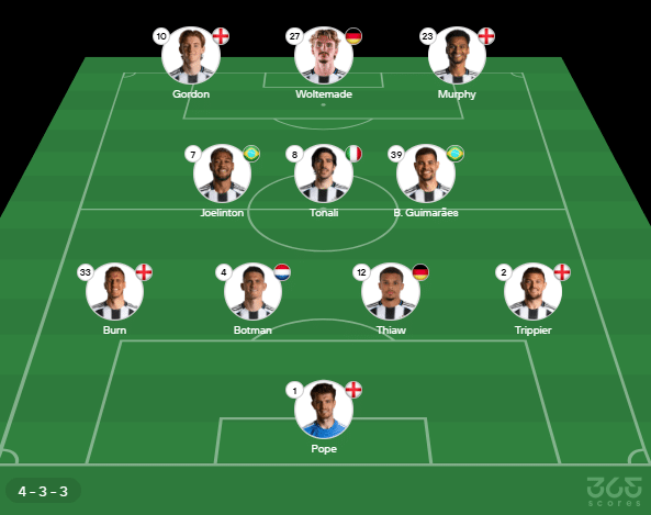 - Provável escalação do Newcastle: Pope; Trippier, Thiaw, Botman, Burn; Bruno Guimarães, Tonali, Joelinton; Murphy, Gordon, Woltemade