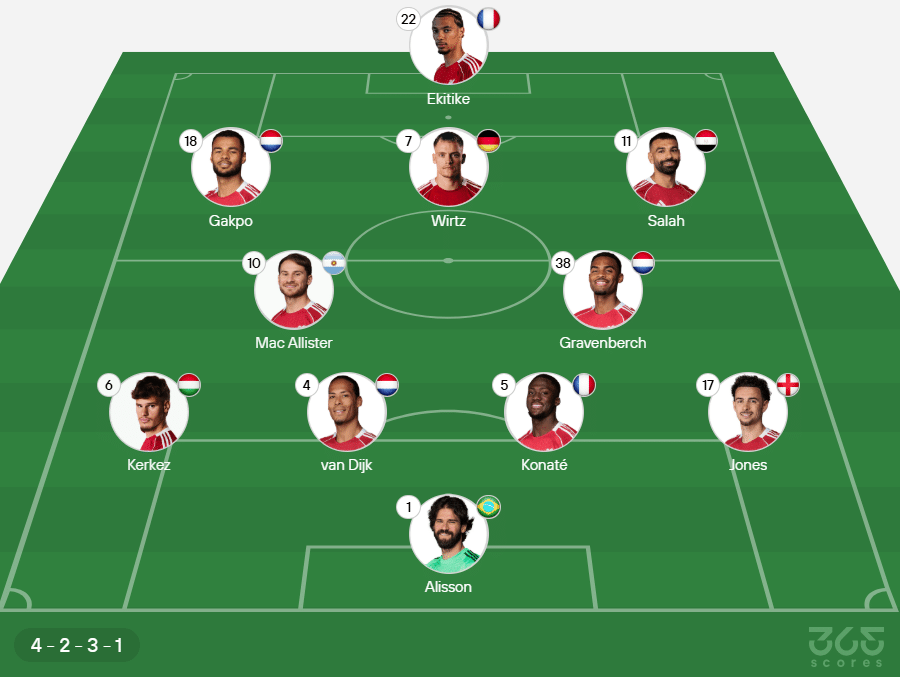 Provável escalação do Liverpool: Alisson; Curtis Jones, Konaté, Van Dijk e Kerkez; Gravenberch e Mac Allister; Wirtz; Mohamed Salah e Gakpo; Ekitike.