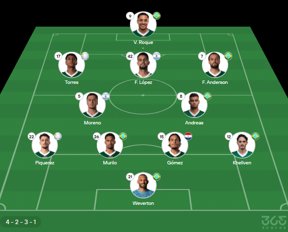 - Provável escalação do Palmeiras: Weverton; Khellven, Gómez, Murilo, Piquerez; Andreas, Moreno, F. López; F. Anderson, Torres, V. Roque