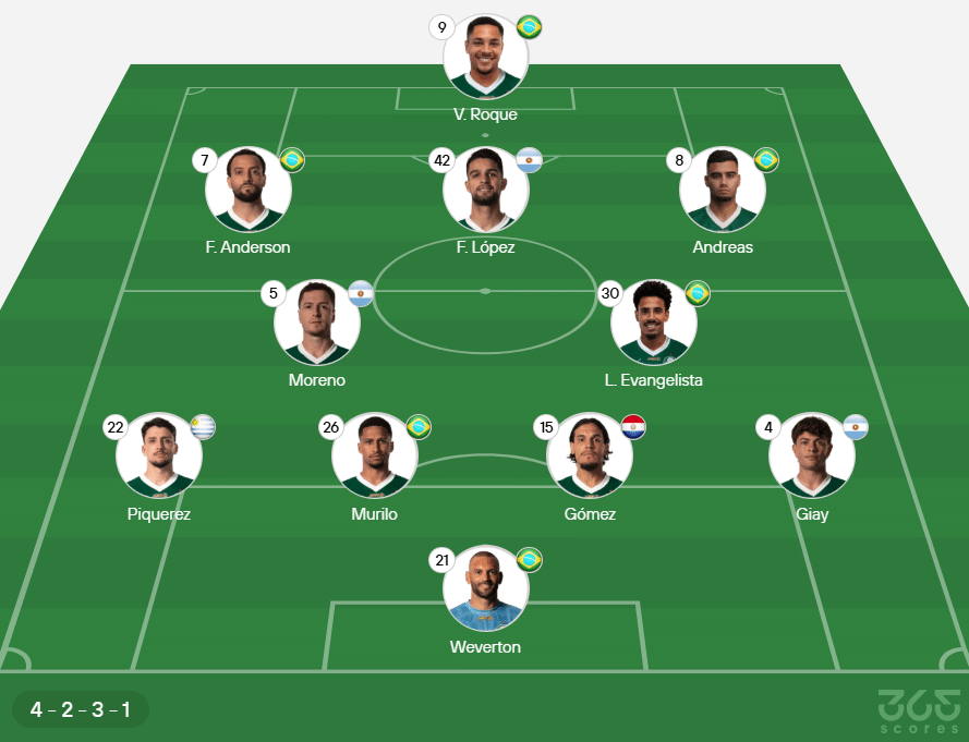 Provável escalação do Palmeiras: Weverton; Giay, Gustavo Gómez, Murilo e Piquerez; Aníbal Moreno e Lucas Evangelista; Andreas Pereira, Felipe Anderson e Flaco López; Vítor Roque.