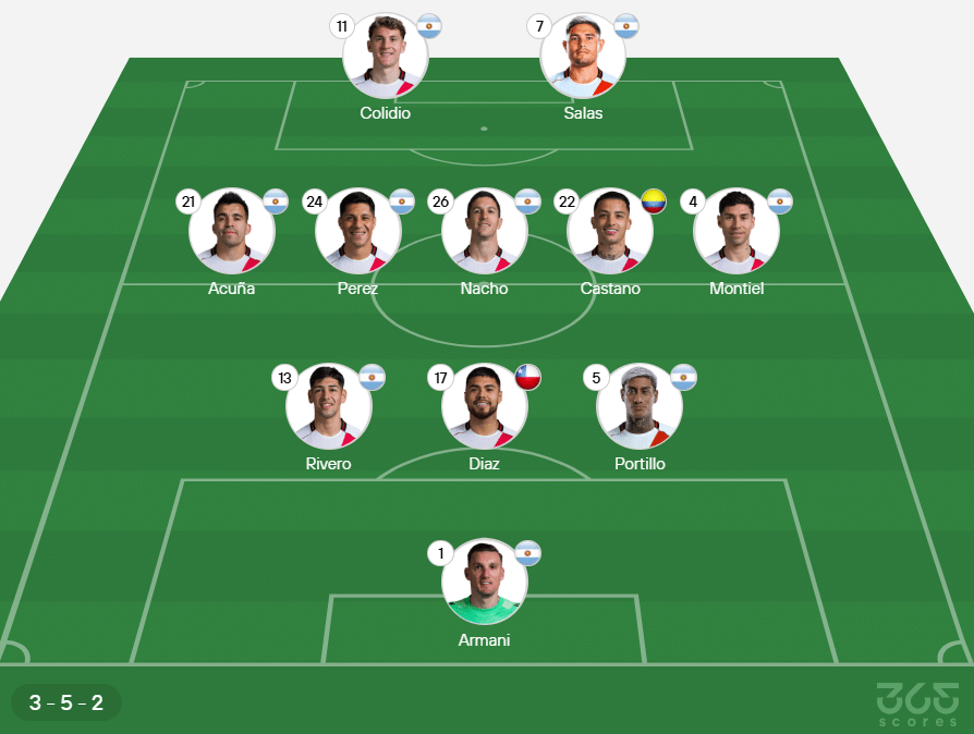 Provável escalação do River Plate: Armani; Portillo, Pablo Díaz e Lautaro Rivero; Montiel, Castano, Nacho Fernández; Enzo Perez e Acuña; Colidio e Salas.