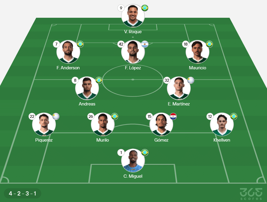 Provável escalação do Palmeiras: Carlos Miguel; Khellven, Gustavo Gómez, Murilo e Piquerez; Emiliano Martínez e Andreas Pereira; Maurício, Felipe Anderson e Flaco López; Vitor Roque.