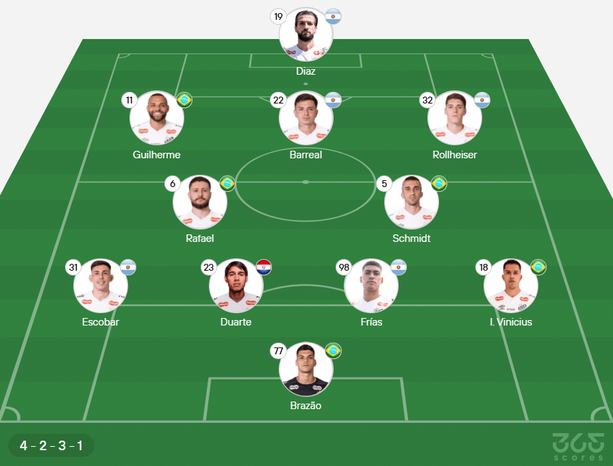 Provável escalação do Santos: Brazão; Igor Vinícius, Adonis Frías, Alexis Duarte e Escobar; João Schmidt e Zé Rafael; Barreal, Rollheiser e Guilherme; Lautaro Díaz.