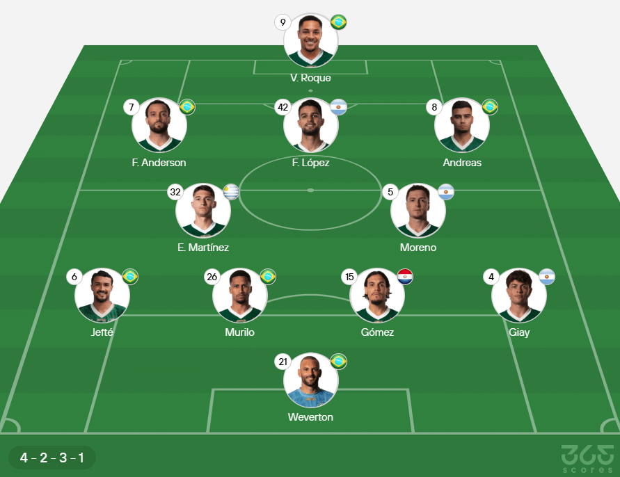 - Provável escalação do Palmeiras: Weverton; Giay, Gustavo Gómez, Murilo e Jefté (Piquerez); Aníbal Moreno e Emi Martínez; Andreas Pereira, Felipe Anderson e Flaco López; Vítor Roque.