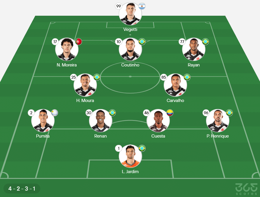 Provável escalação do Vasco: Léo Jardim; Paulo Henrique, Carlos Cuesta, Robert Renan e Pumita Rodríguez; Hugo Moura e Matheus Carvalho; Philippe Coutinho, Rayan e Nuno Moreira; Vegetti.