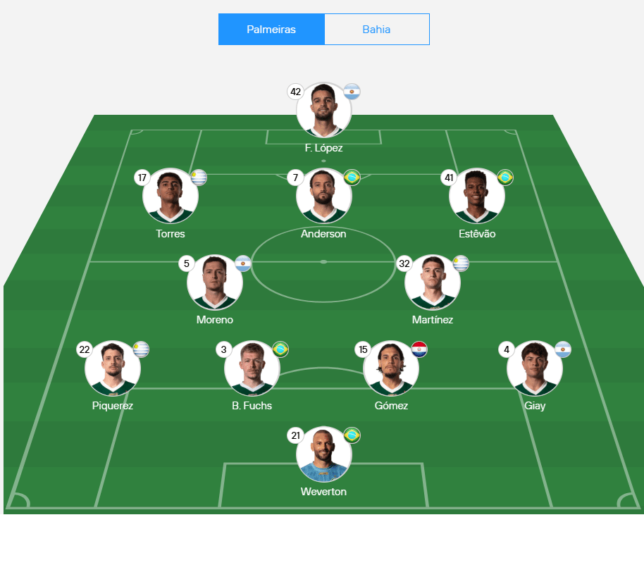 - Provável escalação do Palmeiras: Weverton; Giay, Gustavo Gómez, Bruno Fuchs e Piquerez; Martínez, Aníbal Moreno, Estêvão, Felipe Anderson e Facundo Torres; Flaco Lopez
