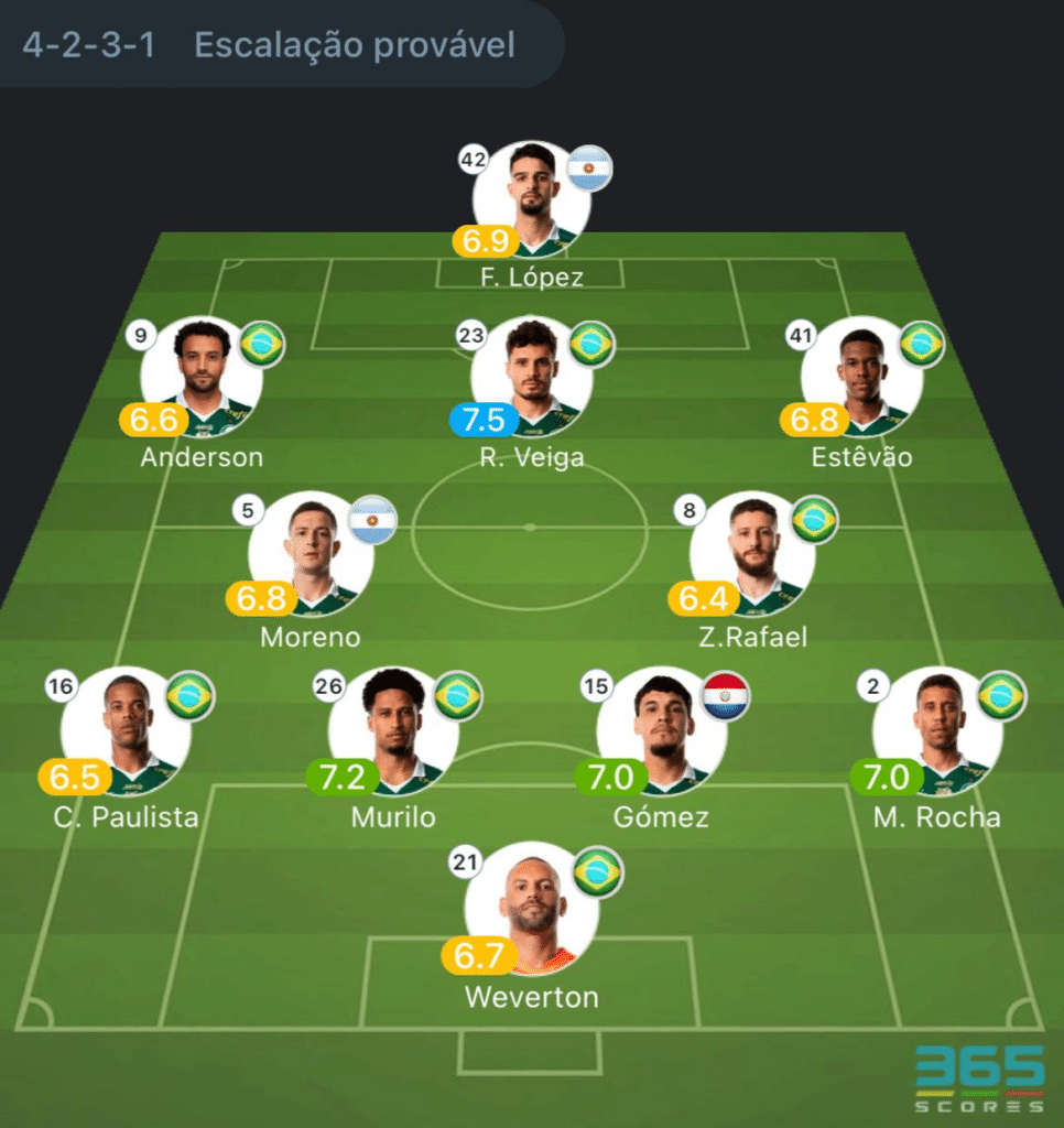Provável escalação do Palmeiras: Weverton; Marcos Rocha, Gustavo Gómez, Murilo e Caio Paulista; Aníbal Moreno e Zé Rafael; Estêvão, Raphael Veiga e Felipe Anderson; Flaco López. Treinador: Abel Ferreira.