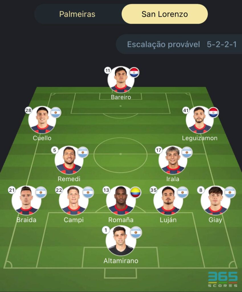 Provável escalação do San Lorenzo: Altamirano, Giay, Luján, Romaña, Campi, Braida; Irala, Remedi, Leguizamon e Cuello; Bareiro.