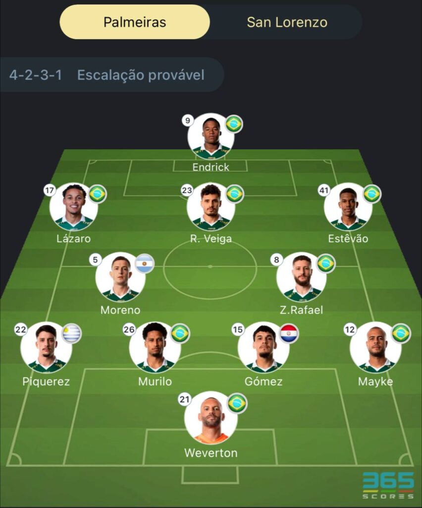 Provável escalação do Palmeiras: Weverton, Mayke, Gómez, Murilo, Piquerez; Zé Rafael, Moreno, Estêvão, Raphael Veiga e Lázaro; Endrick.