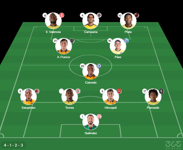 - Provável escalação do Equador: Galindez; Preciado, Hincapié, Torres, Estupiñan; Caicedo, Páez, Alan Franco; Plata, Valencia, Campana