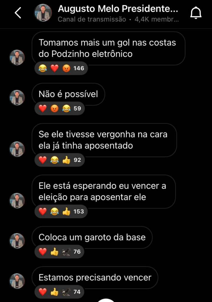 “Podzinho” é o nome de um tipo de cigarro eletrônico. As mensagens do candidato foram enviadas em um canal de transmissão no Instagram após o Timão levar um gol do Fortaleza.