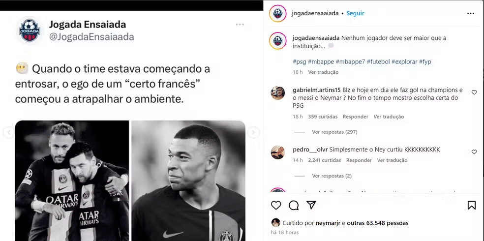 “PSG, um exemplo de gestão no futebol. Conseguiu juntar os melhores jogadores e formou o melhor elenco do planeta. Quando o time estava começando a entrosar, o ego de um “certo francês” começou a atrapalhar o ambiente”, diz um trecho da postagem.