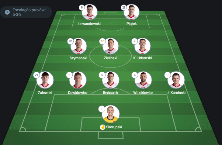 - Provável escalação da Polônia: Skorupski, Zalewski, Dawidowicz, Bednarek, Walukiewicz e Kaminski; Szymanski, Zielinski e Urbanski; Lewandowski e Piatek