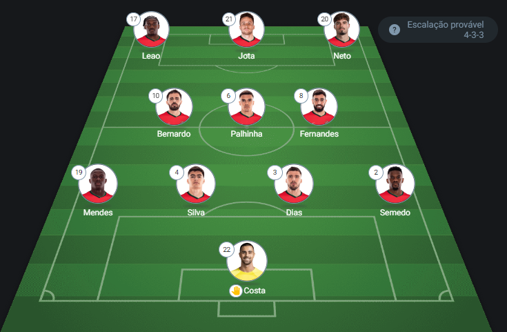 Provável escalação de Portugal: Diogo Costa, Nuno Mendes, António Silva, Ruben Dias e Semedo; Bernardo Silva, Palhinha e Bruno Fernandes; Rafael Leão, Pedro Neto e Diogo Jota. Técnico: Roberto Martínez.
