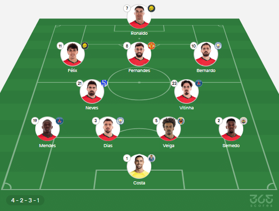 - Provável escalação de Portugal: Costa, Semedo, Veiga, Dias, Mendes; Vitinha, Neves, Bernardo Silva, João Félix, Fernandes, Cristiano Ronaldo