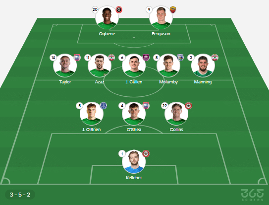 - Provável escalação da Irlanda: Kelleher, Collins, O’Shea, O’Brien; Manning, Molumby, Cullen, Azaz, Taylor; Ogbene, Ferguson