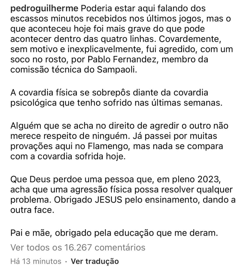 Já na madrugada, o atacante usou as redes sociais para se manifestar sobre o ocorrido. Segundo ele, além da agressão física, vem sofrendo “covardia psicológica” nas últimas semanas. Leia abaixo o desabafo:
