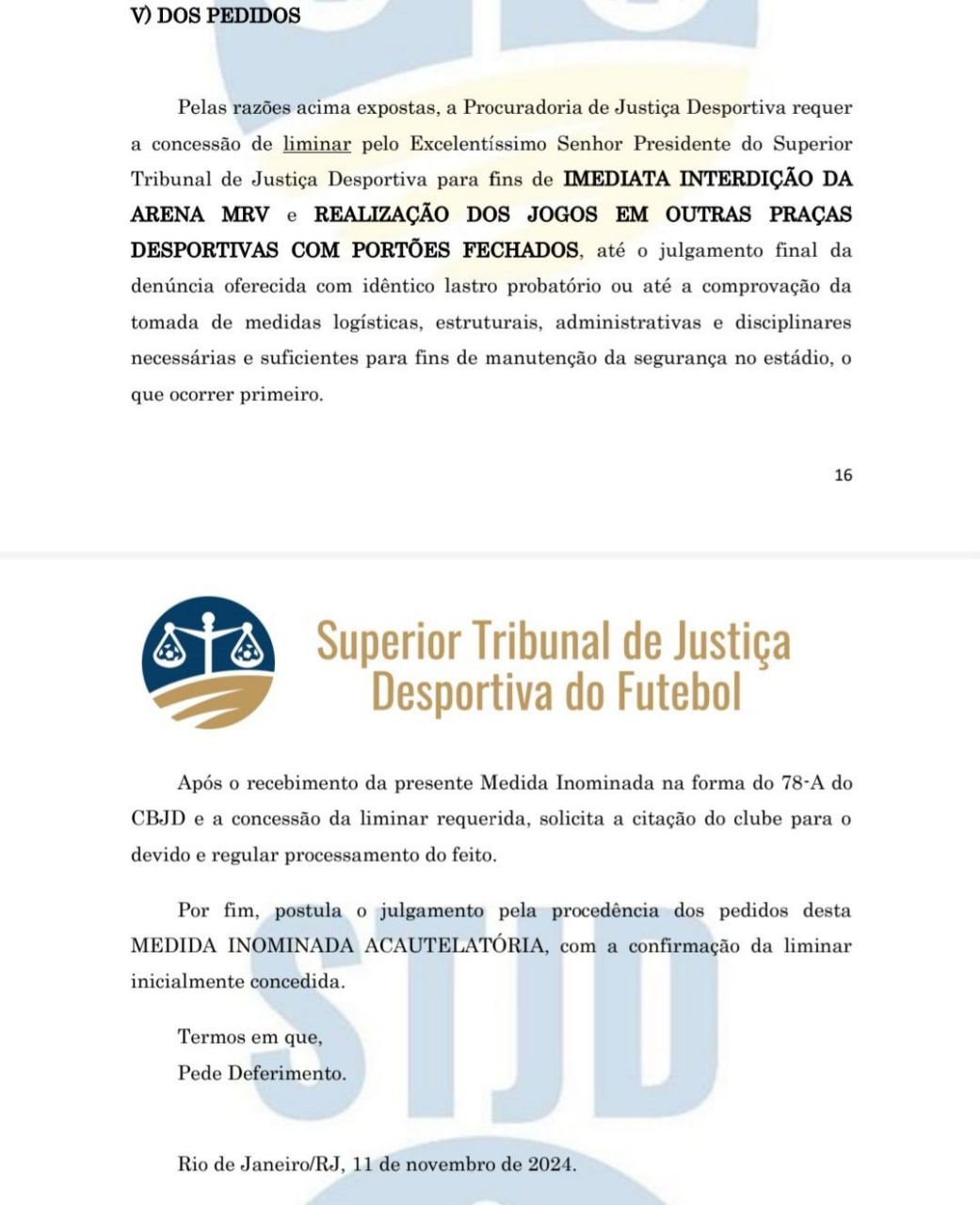 A procuradoria do STJD denunciou o oficialmente o Atlético-MG após as confusões na final da Copa do Brasil. O Galo foi denunciado em dois artigos do Código Brasileiro de Justiça Desportiva. Além disso, o STJD pede que a Arena MRV seja fechada até o julgamento.