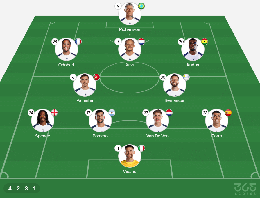 Escalação do Tottenham: Vicario; Pedro Porro, Van de Ven, Romero e Djed Spence; João Palhinha e Bentancur; Xavi Simons, Mohammed Kudus e Odobert; Richarlison.