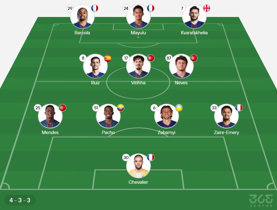 Escalação do PSG: Chevalier; Zaire-Emery, Zabarnyi, Pacho e Nuno Mendes; Vitinha, João Neves e Fabián Ruiz; Barcola, Kvaratskhelia e Mayulu.