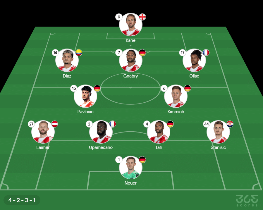 Escalação do Bayern de Munique: Neuer, Stasinic, Upamecano, Tah, Laimer; Kimmich, Pavlovic, Olise, Gnabry, Luis Diaz; Kane. Técnico: Vincent Kompany