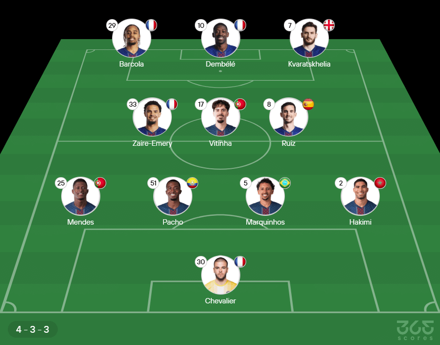 Escalação do PSG: Chevalier, Hakimi, Marquinhos, Pacho, Mendes; Zaïre-Emery, Fabian Ruiz, Vitinha; Kvaratskhelia, Barcola, Dembélé. Técnico: Luis Enrique