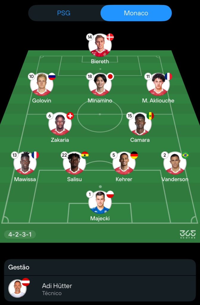 Provável escalação do Monaco: Majecki; Vanderson, Kehrer, Salisu e Mawissa; Camara, Zakaria, Akliouche, Minamino e Golovin; Biereth.