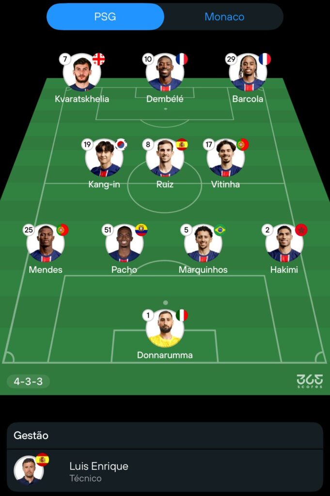 • Provável escalação do PSG: Donnarumma; Hakimi, Marquinhos, Pacho e Mendes; Vitinha, Ruiz, Kang-In; Barcola, Dembélé e Kvaratskhelia.