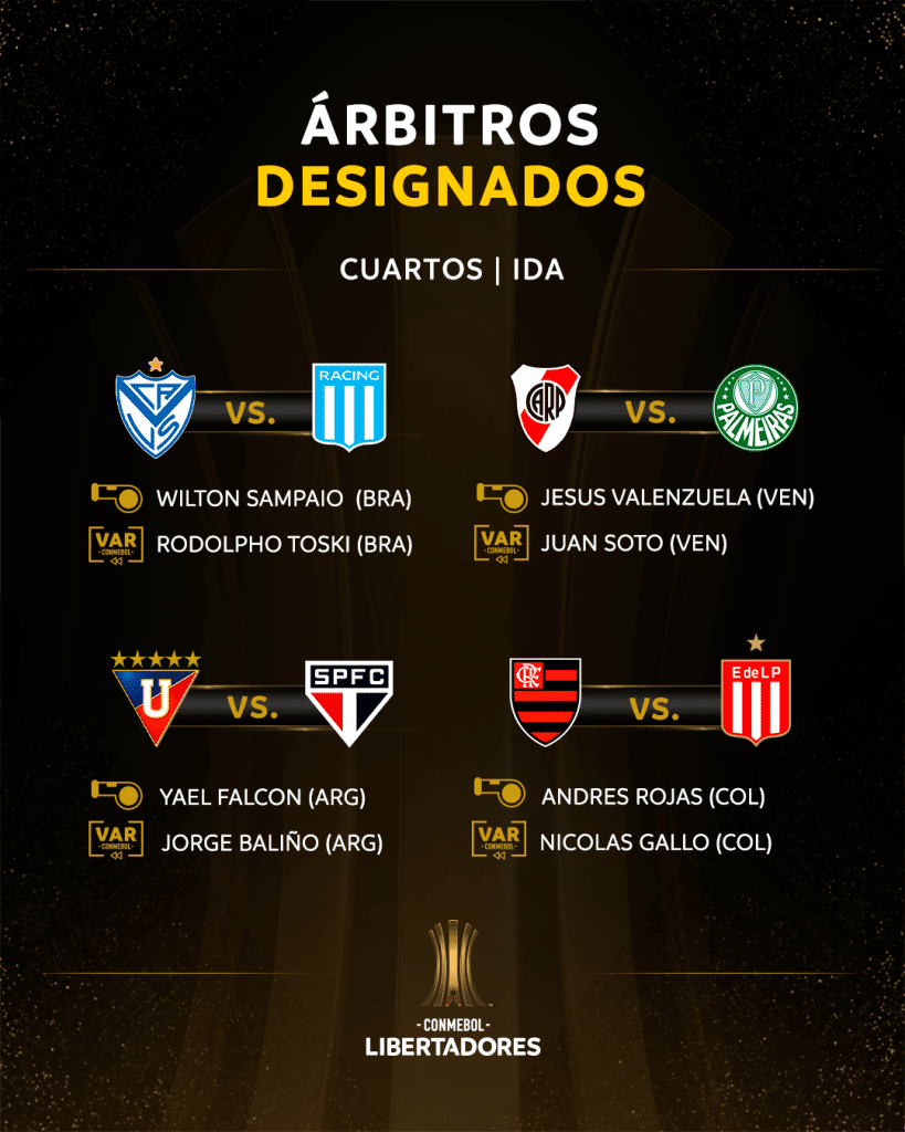 Começa nesta terça-feira (16) a fase quartas de final da Libertadores. Nos quatro jogos, serão três brasileiros na disputa. Em publicação oficial, a Conmebol divulgou quem serão os árbitros responsáveis por cada partida de ida.