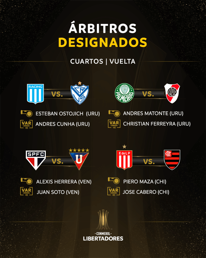 Já o duelo entre Palmeiras e River Plate será apitado por Andres Matonte, do Uruguai. São Paulo e LDU, no Morumbis, terá o comando de Alexis Herrera, da Venezuela. No único jogo em que um time brasileiro não estará envolvido, entre Racing e Vélez, Esteban Ostojich, do Uruguai, será o encarregado.