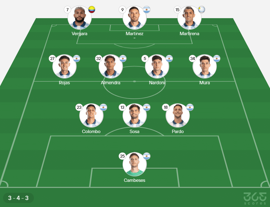 Provável escalação do Racing: Cambeses; Pardo, Sosa e Colombo; Mura, Nardoni, Almendra e Rojas; Martirena, Vergara e Adrian Martínez.